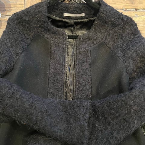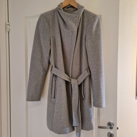 Tiger of Sweden kåpe for dame i størrelse 34. Kåpen er grå og laget i ullmateriale med glatt fôr på innsiden. Modellen har asymmetrisk lukking foran og høy krage med knappelukking. Lengden går omtrent til midt på låret, med lange ermer og skråstilte lommer i sidene.