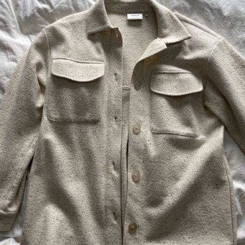 Vero Moda Aware jakke for dame i størrelse L. Jakken er beige og laget i polyester. Modellen har krage, trykknapper i front og to brystlommer med klaff. Rett passform og lange ermer. Egnet som lett ytterjakke eller overskjorte i overgangssesonger.