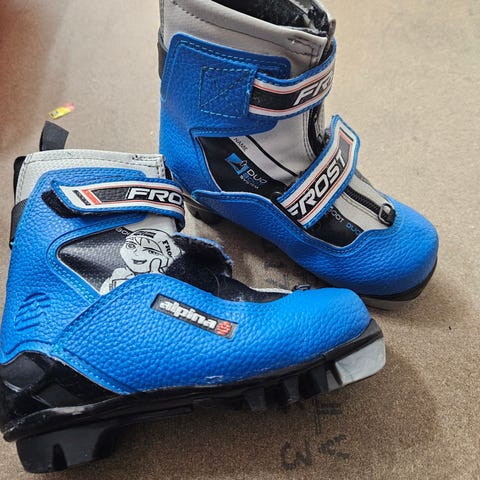 Frost langrennsstøvler i blå og hvit farge. Støvlene har snøring med glidelås og borrelåsrem over vristen for bedre støtte. Grovmønstret yttersåle gir godt feste ved gange uten ski. Passer til klassisk langrenn. Egnet for barn eller mindre føtter, størrelse må oppgis av selger.