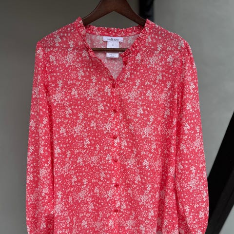 Untold Stories: Greenpoint Ruffle bluse str. L selges. Blusen har blomstrete mønster i lilla, mint og fersken farger. Rysjer ved skuldre og over ermene. 100 % bomull.