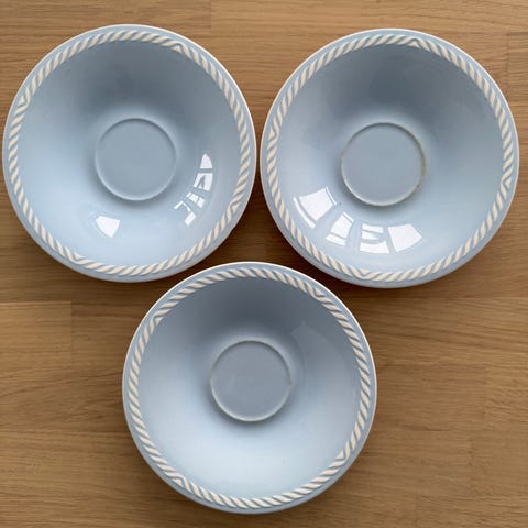 Jeg har arvet disse, men aldri brukt de. Ingen skår eller skader. En bitteliten lysebrun flekk i emaljen slik ene bildet viser.