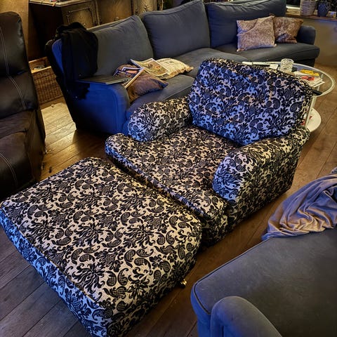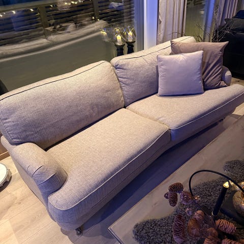 Buet 3 seter Howard sofa med 2 stoler og 1 Loveseat. Taupe velour. Den ene stolen er armlene liten bøy i. Sees ikke men kjennes når du har armen på armlenen.