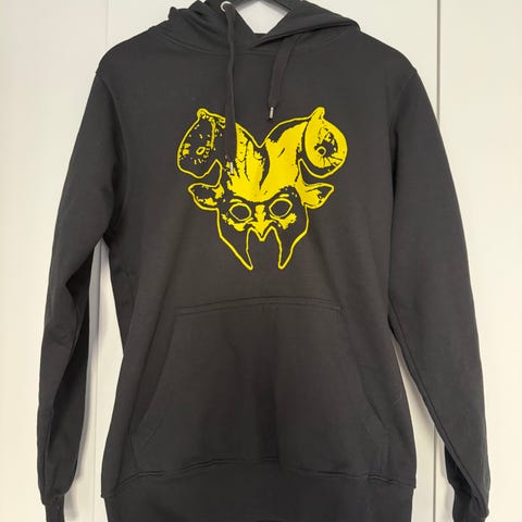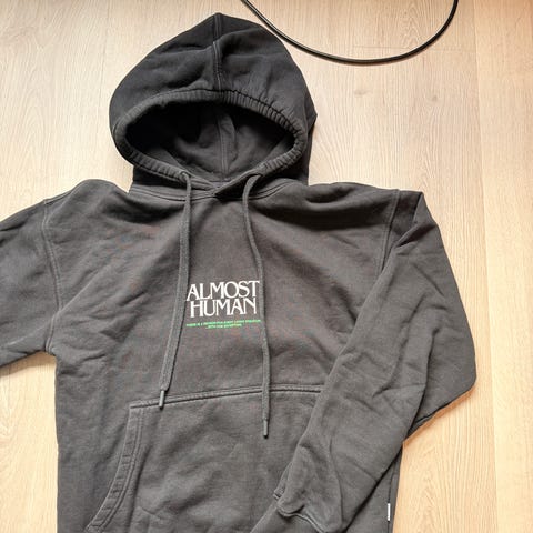 Selger en hettegenser til menn str M 🖤 Godt brukt, noe nuppete og utvasket farge, selges derfor billig. Svart/sort med grønn pil på brystet. 65/35% polyester/bomull.