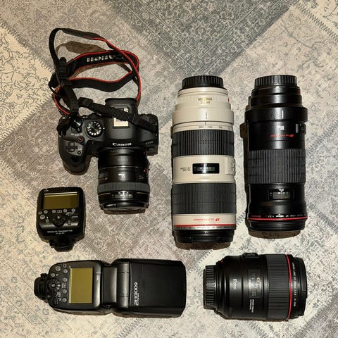 Kameraet er et digitalt systemkamera i Canons EOS R-serie med RF-fatning. Huset har elektronisk søker, vridbar LCD-skjerm på baksiden og flere programmerbare knapper og hjul for manuell kontroll. Batteri vises på bildene. Kameraet egner seg for foto og video i ulike situasjoner, fra hverdagsbruk til mer avansert fotografering, og kan kombineres med et bredt utvalg RF-objektiver og tilbehør som blitser og eksterne mikrofoner.