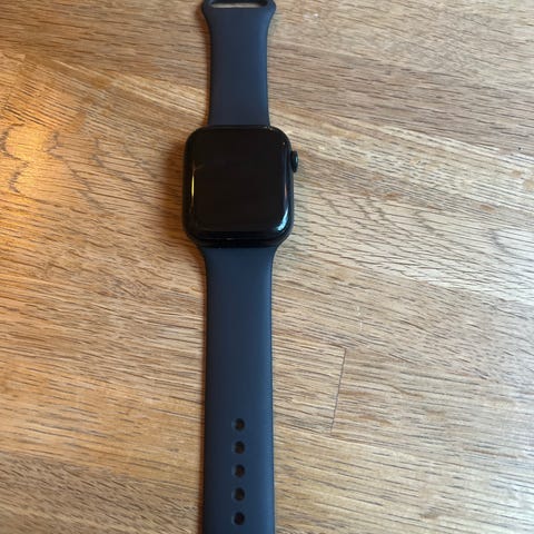 Apple Watch smartklokke med sort silikonreim. Rektangulært urkasse-design med berøringsskjerm. Klokken leveres med justerbar reim med hullfeste. Egnet til bruk som aktivitets- og treningsklokke, varsler fra mobil og generell hverdagsbruk.