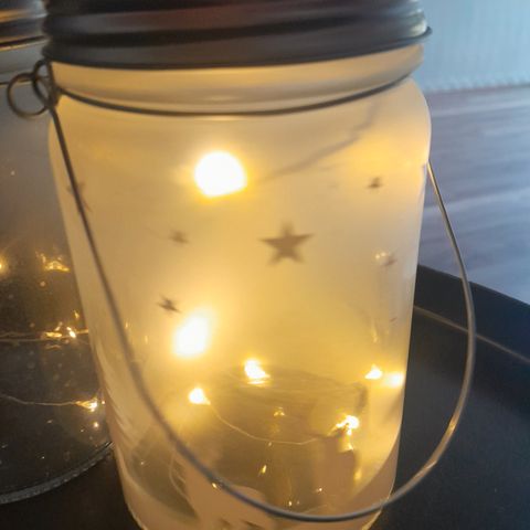 Det er glass sylinder inni som kan tas ut. Bark rundt med utskåret stjerner. Den er 25 cm høy og 14 cm i diameter. Pent brukt.