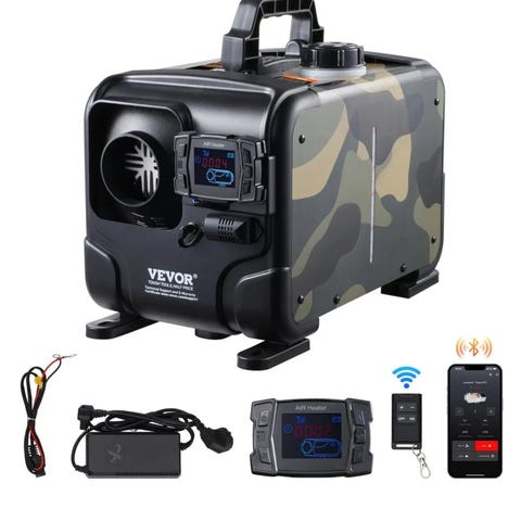 Vevor dieselvarmer i frittstående enhet med integrert drivstofftank og kontrollpanel. Enheten har oransje ytterkasse med sorte detaljer, bærehåndtak på toppen og tilkoblingskabler på baksiden. Varmeren er egnet for oppvarming av mindre rom, garasje, verksted, bobil eller lignende der det er behov for dieselbasert varme. Leveres med original eske fra Vevor.