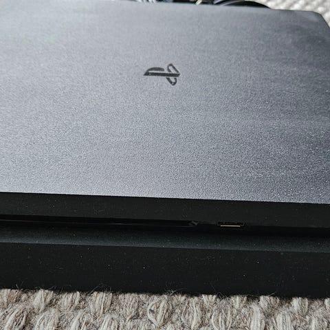 Sony PlayStation 4 Slim 500 GB (Konsollen er i perfekt stand, og kontrolleren har slitasje på venstre analog og en rift på lokket på høyre analog, men den fungerer fint)