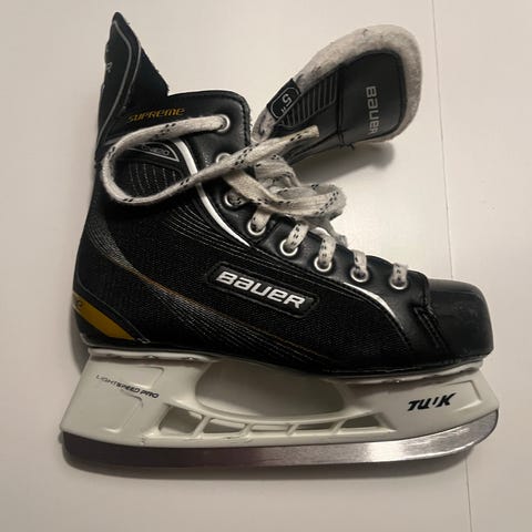 CCM ishockeyskøyter for barn i EU størrelse 32. Skøytene er svarte med hvite lisser og hvit skøytestålramme. Egnet til ishockeybruk på isbaner. God brukte, må mulig slipes