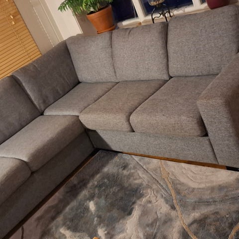 Selger en stor og behagelig hjørnesofa med god sittekomfort. Sofaen er brukt og har normal bruksslitasje. Ett armlene har en liten skade, men denne er ikke synlig og påvirker ikke komfort eller bruk.