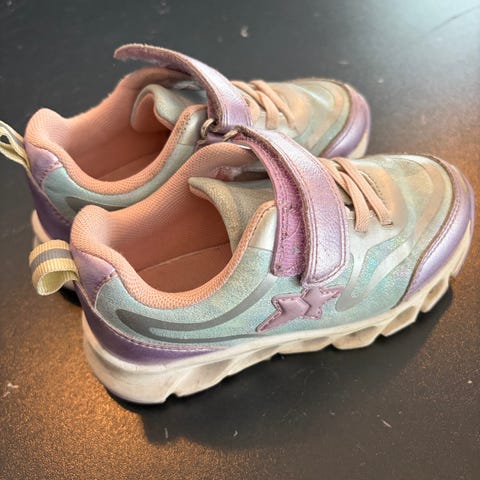 Selges videre da de har blitt for små. Kjekke blinkesko med glitter og vinger. Noe bruksmerker på tåa, men mye bruk igjen!