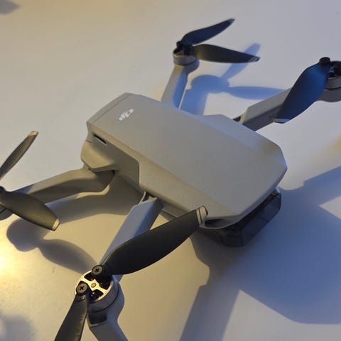 DJI Mavic Mini drone i kompakt og sammenleggbart design i grå farge. Dronen har integrert kamera montert på gimbal i front. Bildene viser et sett som inkluderer drone, fjernkontroll, flere batterier, propeller, kabler, lader og bæreveske. Egnet for foto og video fra lufta, samt enkel transport og oppbevaring i medfølgende veske.