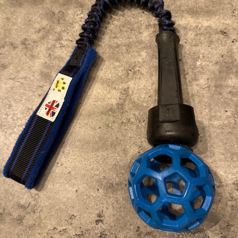 Selger en svært lite brukt draleke til hund fra Paws Made med kaninpels og ball