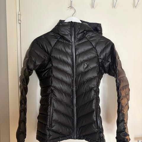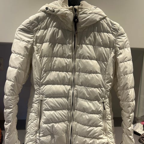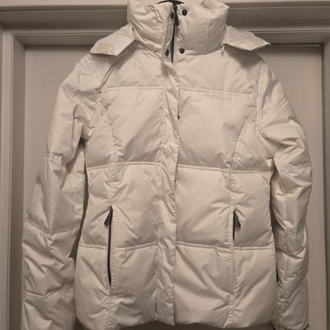 Peak Performance vinterjakke i XS. Jakken er hvit med quiltet mønster. Den har snølås med muligheter for å knappe med bukse.