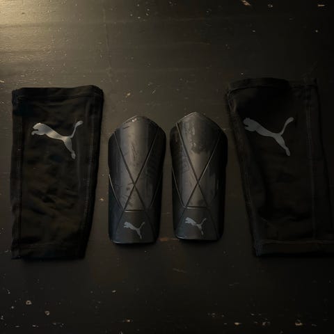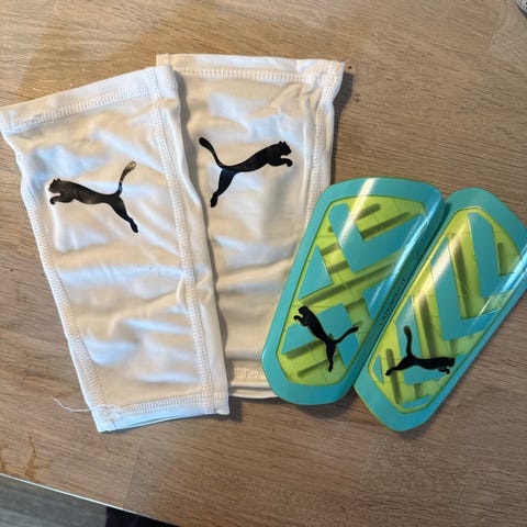 Umbro leggskinn for barn. Leggskinnene har hard ytterskall med grafisk mønster i svart, hvitt, rødt og blått, og polstret innside for økt komfort. De festes med justerbare borrelåsremmer rundt leggen for å sitte stødig under bruk. Egnet til fotball og annen aktivitet der beskyttelse av leggene er nødvendig.