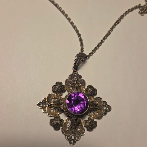 Flott stand. Ingen bruksslitasje. Det gylne filigranarbeidet er lyst og fint (ikke mørknet) Fremstår som lite brukt. Nål på baksiden med sikkerhetslås i god stand. Kan sendes med postnord kr 69 som blir rimeligst om du vil unngå fiks ferdig.