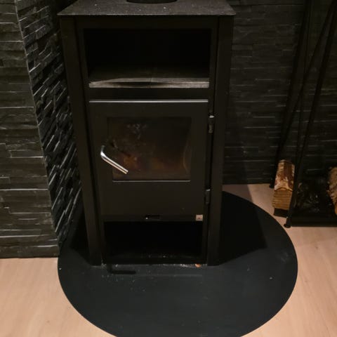 Frittstående vedovn i mørk/svart farge. Selges kr 1000. Må hentes uken før jul grunnet riving av hus.