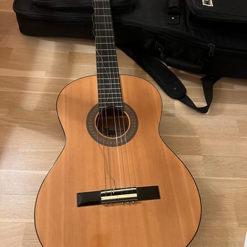 Dimmi Class akustisk gitar i naturfarget treverk. Gitaren har klassisk nylonstrengs-konstruksjon med tradisjonell rosett rundt lydhullet. Kropp, hals og gripebrett er i lakkert treverk med lys brun finish. Leveres med polstret svart gigbag med flere lommer for oppbevaring av tilbehør. Egner seg til akustisk spilling og øving.