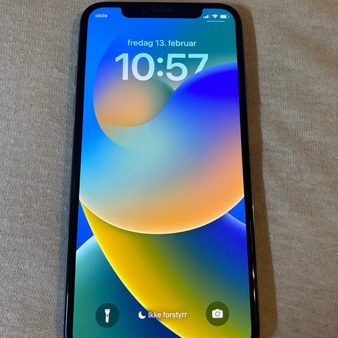 Apple iPhone mobiltelefon med 128 GB lagringsplass. Modellen har berøringsskjerm over hele fronten og fysisk sideknapp. Telefonen egner seg til vanlig bruk som surfing, sosiale medier, meldinger og samtaler, samt lagring av bilder, video og apper. Bilder viser at skjermen har riper og sprekk nederst, samt merker langs kanten av rammen. Enheten kan brukes med kompatible ladere, hodetelefoner og annet standard iPhone-tilbehør.