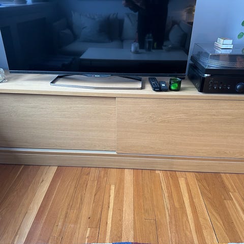 Vi har tatt av beina, men disse følger med og kan enkelt settes på. Det er skjært ut et lite hull bak kommoden for å dra inn ledninger siden vi har brukt den som tv benk. Dette er ikke synlig. Kommoden er i fin stand. Må hentes i 3 etasje på Sagene.
