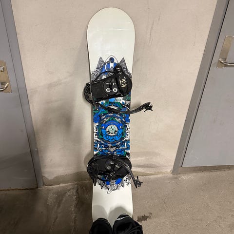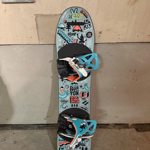 Burton Verdict snowboard med grafisk design på oversiden og standard svart såle. Snowboardet leveres med svarte Burton-bindinger med justerbare stropper og høy rygg for støtte.