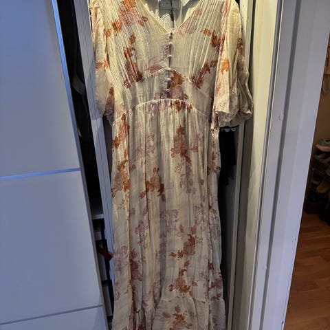ByTiMo Chiffon Gown er en elegant kjole laget av lett og gjennomsiktig FSC-sertifisert viskose. Kjolen har en maxilengde og en figurnær midje, med lange ermer som har rynkedetaljer og puffede skuldre. Den har en rund halslinje med en knapp foran, som kan bæres både åpen eller lukket. Skjørtet er designet med flere lag volanger. Modellen er 175 cm høy og har på seg størrelse L.