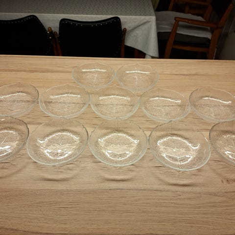 6 perfekte desserskåler. 14.5 cm diameter. 1 skål 12.5 cm. 2 boller. 22.5 cm og 18 cm i diameter. Litt slitasje på den største. Kr 50 pr asjett og kr 100 for begge bollene. Kan sende og pakker godt.