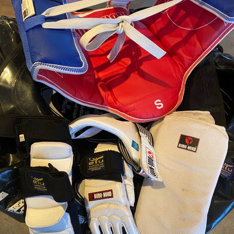 Mooto og Budo-Nord taekwondo beskyttelsesutstyr sett i blå og hvit farge. Settet inneholder blå Mooto brystbeskytter, hvite hansker, hvit susp/lyskebeskytter, hvite legg- og fotbeskyttere fra Budo-Nord. Størrelse M. Hvit hjelm/hodebeskytter og svart treningsbag. Utstyret er egnet til taekwondo-trening og kamp, med polstrede flater og justerbare stropper for feste. Passer til utøvere som trenger komplett grunnsett med beskyttelse til kampsporttrening.
