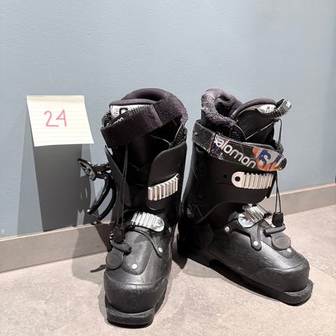 Salomon Mission skistøvler i størrelse 29 Modellen har fire justerbare spenner i metall og powerstrap øverst for bedre tilpasning rundt leggen. Støvlene er i fargene svart og sølv, med polstret innerstøvel for komfort. Egnet til alpint bruk i preparerte bakker.