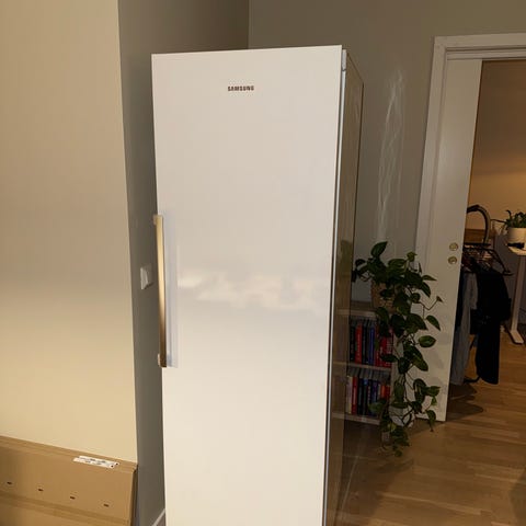 Frittstående høyskap-kjøleskap med én dør og vertikalt håndtak i metall. Innvendig har skapet flere justerbare glasshyller, dørhyller for oppbevaring av flasker og mindre varer, samt egen hylle for flasker/vinflasker. Energimerking A+