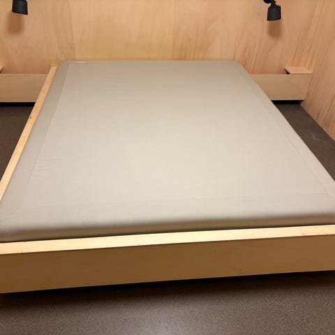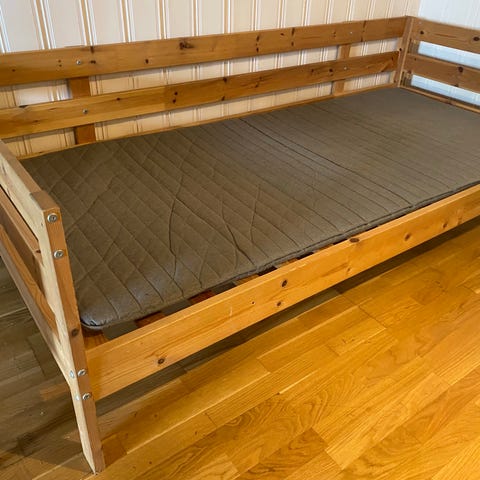 Seng og madrass fra IKEA i størrelse 140 x 200 cm.