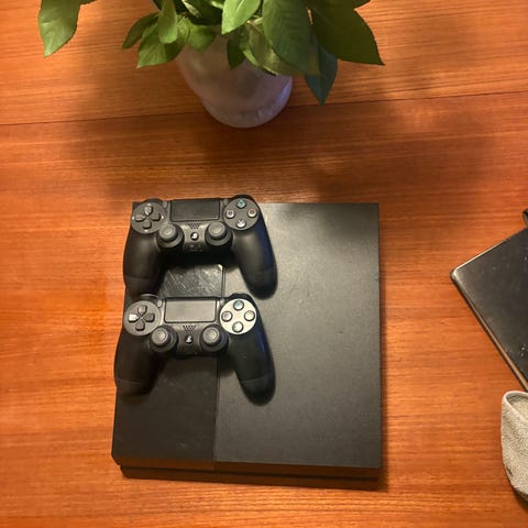 Sony PlayStation 4 spillkonsoll i svart farge med to trådløse DualShock 4-kontrollere. Konsollen kobles til TV via HDMI og har strøm- og ladekabler til kontrollerne. På bildene følger det også med fysiske spill, blant annet Call of Duty: Modern Warfare og et Spider-Man-spill. Egnet for bruk med PlayStation 4-spill og tilkobling til internett for nedlasting av spill og oppdateringer.