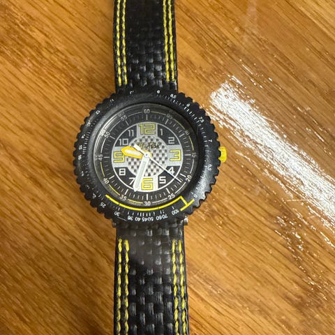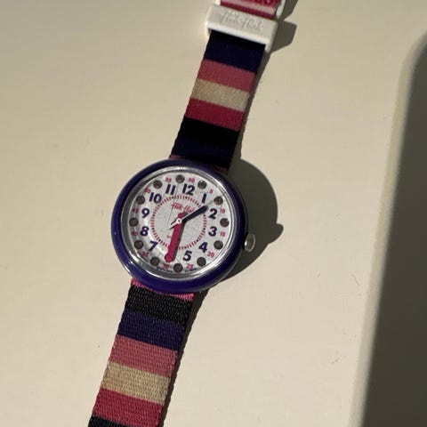 Swatch Flik Flak armbåndsur unisex med analog urskive. Klokken har hvit tallskive med arabiske tall og sekundviser, samt sort bezel rundt urkassen. Remmen er brun og festes med klassisk spenne. Urkassen er merket «Flik Flak Swiss Made».