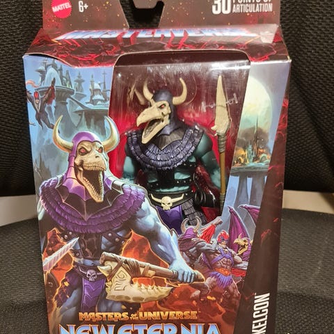 Mattel Masters of the Universe Revelation Masterverse Deluxe Faker, ny i eske. En ordentlig kul Faker som faktisk kunne lurt noen til å tro han er He-man (dvs, han er ikke blå 😊). Tre hoder med forskjellig grad av "battle damage".