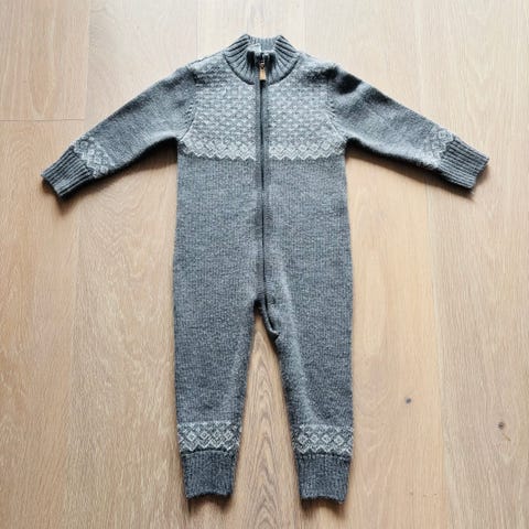 Name it ulldress for jente i størrelse 110. Heldress i ull med lange ermer og lange ben. Flerfarget mønster øverst og ensfarget nedover ben og ermer. Glidelås foran for enkel av- og påkledning. Strikket materiale i ull som egner seg godt som mellomlag eller inneplagg på kjølige dager.