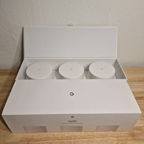Google Wifi mesh-ruter i hvit farge. Enheten er beregnet for trådløst hjemmenettverk og kan brukes alene eller som del av et mesh-system for å dekke større områder med wifi. Enheten kobles til strøm og til modem/ruter via nettverkskabel og fordeler deretter trådløst nett til tilkoblede enheter i boligen.