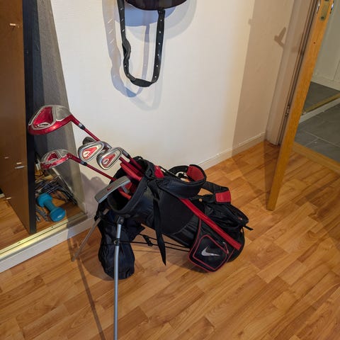 Nike VRS junior sett med bag til salgs. Inneholder driver, 4 hybrid, sandwegde, 7 jern og putter. Lengden på skaftet til driveren er 95 cm.