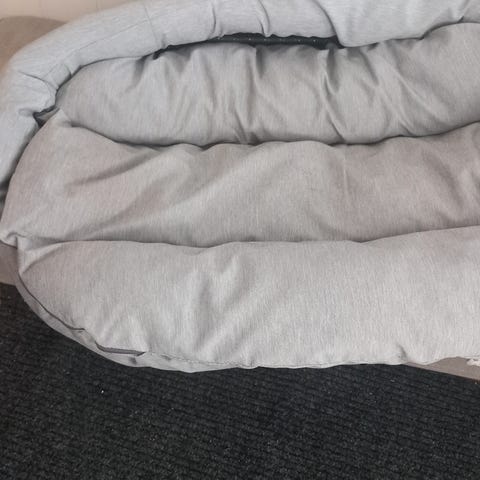 Rund hundeseng i grå farge, 80cm. Sengen har en myk kant rundt hele. Passer til mellomstore hunder. Selger denne hundesengen fordi hunden min ikke er interessert i å sove i den. Han har bare ligget i sengen når vi har trent på å legge seg ned. Sengen er like fin som ny.