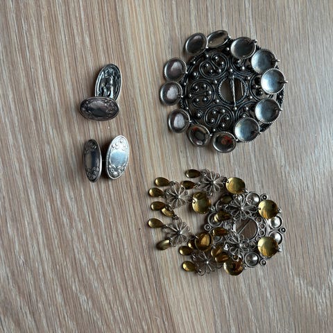 13 store og 14 små tinnknapper til herrebunad fra Nordland selges samlet for 2500 kr. Pris fra forretning 3500
