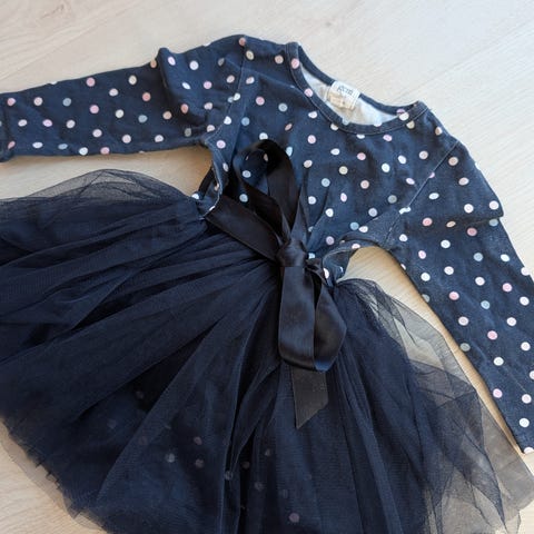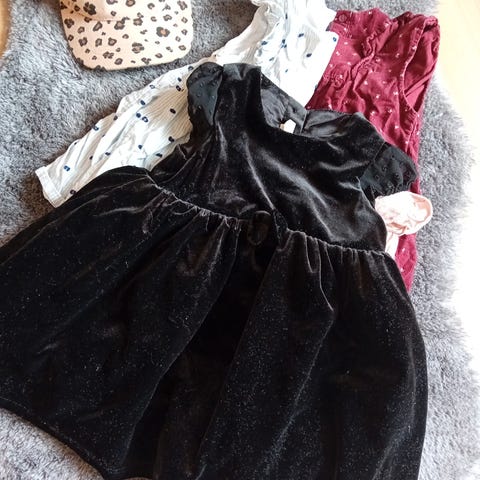 Seks kjoler, de fleste i størrelse 86, samt en kjole i strl 80 og en stl 90. Pent brukt, klare for å reise videre til et annet klesskap.