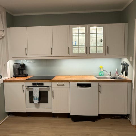 Kjøkkeninnredning med overskap og underskap i blå frontfarge og profilerte fronter gis bort mot henting og demontering. Innredningen inkluderer benkeskap, overskap med glassdører og benkeplate i mørk utførelse. Det er avsatt plass til frittstående hvitevarer som komfyr, kjøleskap og vaskemaskin, samt opplegg for kjøkkenvask og armatur. Løsningen passer for mindre kjøkken eller som ekstra kjøkkeninnredning i leilighet eller hybel. Eventuelle hvitevarer, stol, bord og annet løst inventar som vises på bildene er ikke nødvendigvis inkludert i leveransen.