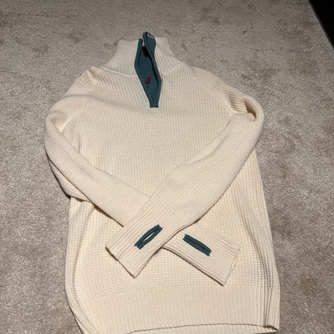Selger en Ulvang ullgenser for herre i størrelse L. Genseren er strikket i ull og har blå hovedfarge med oransje detaljer. Høy, ribbestrikket hals og lange ermer.