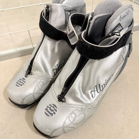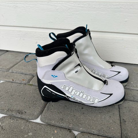Alpina langrennsstøvler i størrelse 40. Modellen har hvit overdel med snøring, glidelås og borrelåsrem over ankelen for ekstra støtte. Innsiden er fôret for økt komfort og varme. Sålen er tilpasset moderne langrennsbindinger (se bilde av såle for detaljert type). Egnet til klassisk langrennstrening og turbruk.