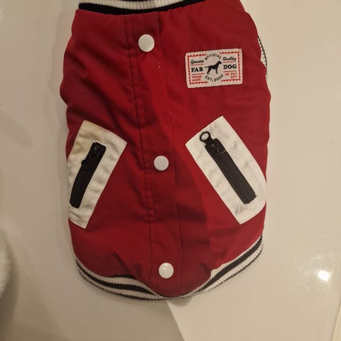 Jakken har åpning på sidene for bena og lukkes med trykknapper, noe som gjør den enkel å ta av og på. Gir god beskyttelse mot kulde og vind, samtidig som hunden kan bevege seg fritt.