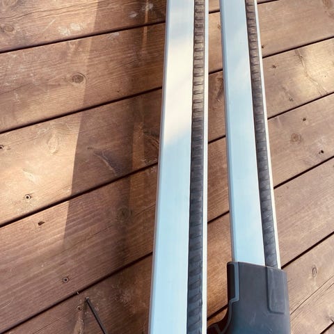 Thule takstativ i aluminium med plastender. Stativet består av to lastestenger i spor for montering av takboks eller annet taklastutstyr. Profilene har spor for innfesting av tilbehør eller oppheng. Passer til flere bil med passende festesystem for denne typen Thule-stativ. Storelse er på bilder .