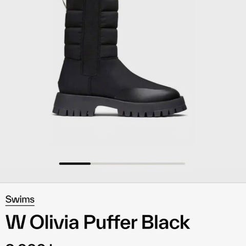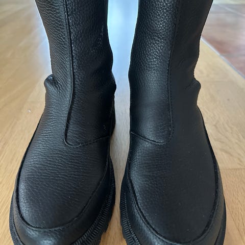 SWIMS vinterstøvler i størrelse 39. Støvlene er i svart farge med kraftig, mønstret yttersåle for godt grep. Overdelen er polstret og isolert for å gi varme, med hemper bak som gjør dem enkle å ta av og på. Egner seg til bruk i kaldt og vått vær, til hverdags og fritid. Selv om størrelsen er 39, er de svært små i størrelsen og vil passe best en som bruker 37. Jeg bruker til vanlig 38.