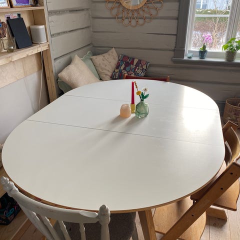 Gies bort. Bestemors frokost bord med innleggsplate + stoler fra 60-tallet. Et strøk maling og lakk for en helt ny følelse, men sjarmerende nydelig som det er!