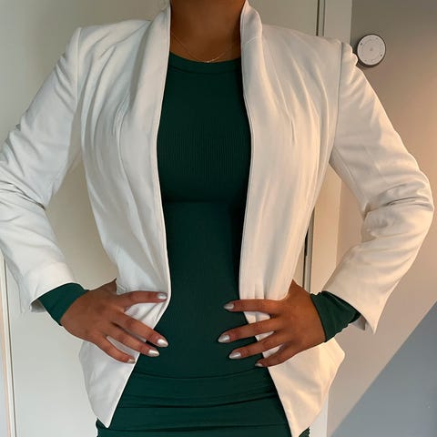 Hvit Zara blazer for dame i størrelse S. Den har krage med slag, lukkes foran og har lommer i front. Ermene er trekvartlange med oppbrett og stropp med knapp. Passer til bruk over kjoler, bukser eller skjørt i både formelle og uformelle sammenhenger.