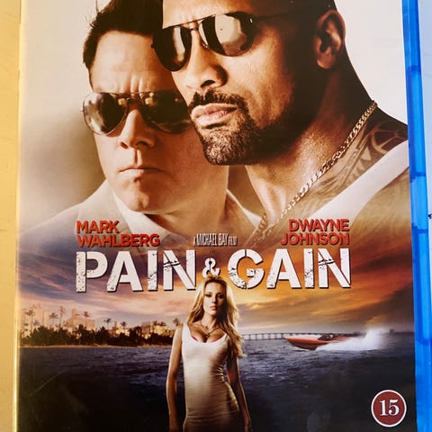 Spillefilm utgitt på Blu-ray-disc. Forsiden viser tittel «Pain & Gain» med skuespillere på omslaget. Baksiden oppgir aldersgrense 15 år i Norge og informasjon om lyd- og bildeformater tilpasset Blu-ray. Filmen leveres i standard Blu-ray-plastomslag med trykket cover.
