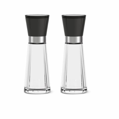 Flott sett med saltbøsse og pepperbøsse i børstet stål og sort plast. Elegant og smalt design. Fra Auerhahnn.